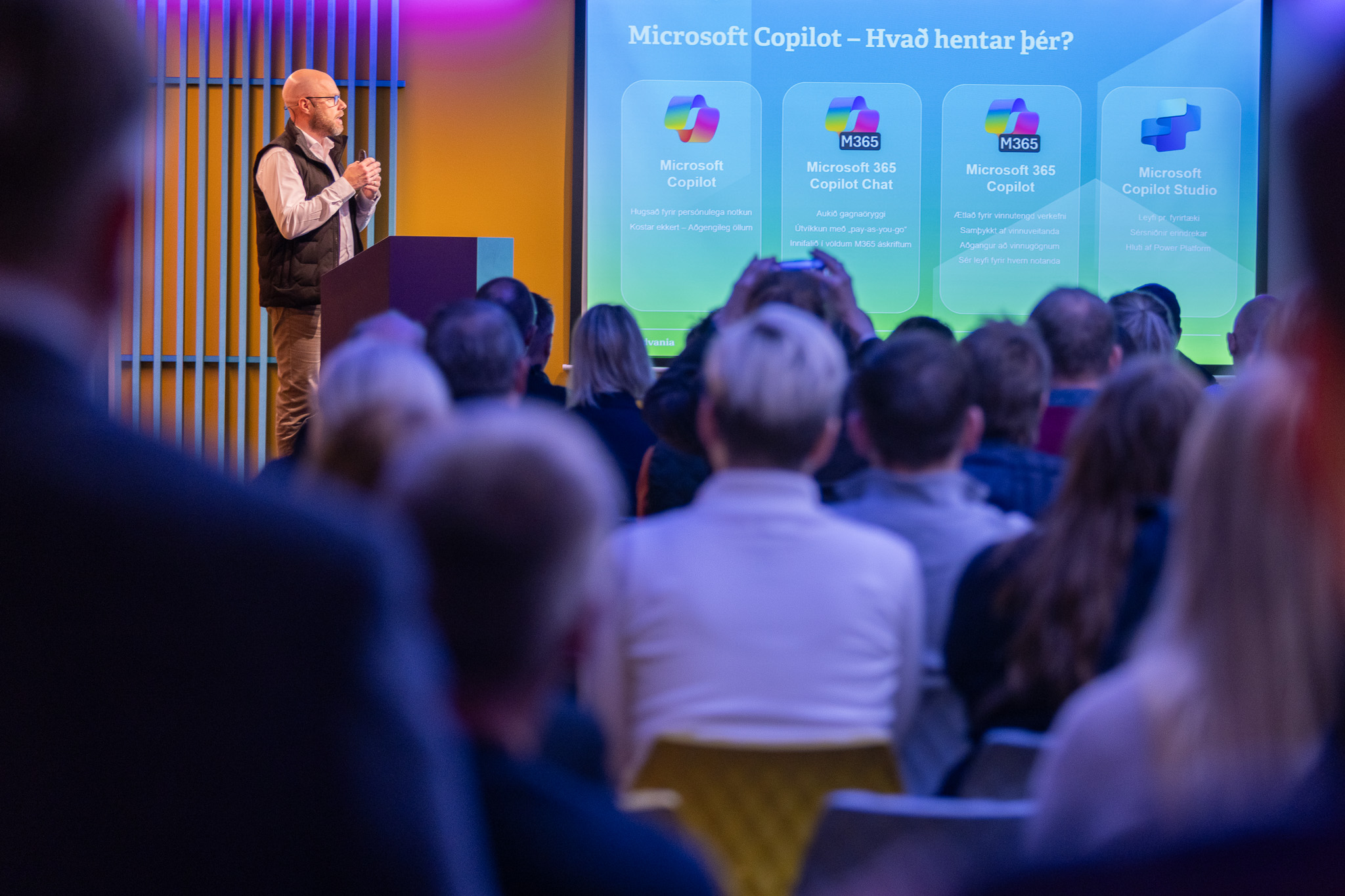 Högni Hallgrímsson, forstöðumaður Power Platform og gervigreindar, hélt erindið Hraðari lausnir, minna flækjustig og meiri kostnaður. Í þessum fyrirlestri sýndi hann hvernig low-code lausnir í Power Platform einfalda ferla, stytta leiðina frá hugmynd að lausn og lækka tilheyrandi kostnað — án þess að fórna öryggi, stýringu eða skalanleika. Farið var yfir hvað er nýtt og næst í Power Platform og sýnd voru raunveruleg dæmi um vörur sem hægt er að byrja að nota strax í dag.